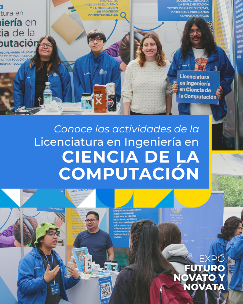 Entre el 7 y 9 de octubre, la Licenciatura en Ingeniería en Ciencia de la Computación será parte de la Expo Futuro Novato y Novata, con una programación especial pensada para inspirar, orientar y acercar la tecnología a quienes están decidiendo su futuro académico. La Expo Futuro Novato y Novata UC se destaca por ser la feria universitaria más grande del país, en donde tradicionalmente durante tres días la Pontificia Universidad Católica recibe a miles de asistentes que participan cada año. Siendo una gran oportunidad para quienes están explorando su futuro estudiantil. A través de charlas, talleres y experiencias interactivas, profesores y profesoras del programa que compartirán su visión, proyectos y conocimientos sobre la computación como una herramienta creativa, crítica y transformadora. Estas son las actividades programadas: 7 de octubre 8 de octubre 9 de octubre ¡Ven a conocer la Ciencia de la Computación como nunca antes!Te esperamos en la Expo Futuro Novato y Novata para descubrir cómo la computación puede ser el motor de tu vocación. Recuerda que puedes inscribirte en las actividades en el stand de la carrera en donde estarán nuestros embajadores para poder ayudarte y responder tus dudas.